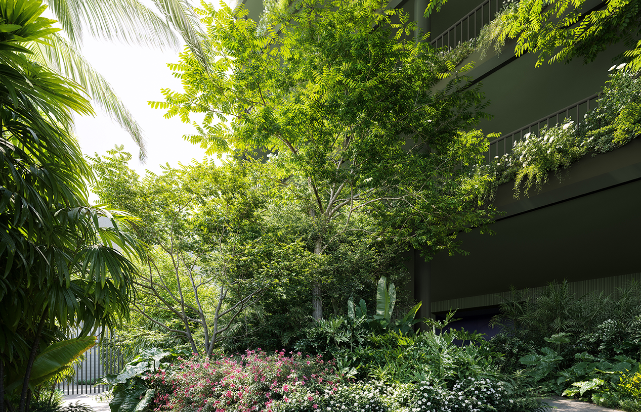 A materialidade, marcada por volumes precisos e texturas sóbrias, suaviza-se com o paisagismo naturalista de Rodrigo Oliveira, que povoa fachadas e lajes com espécies nativas, cria microclimas, atrai biodiversidade e intensifica a sensação de floresta urbana.